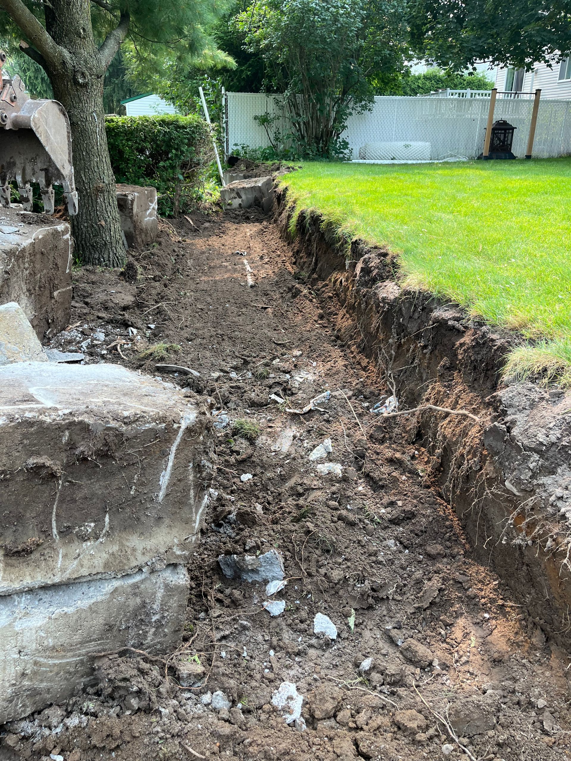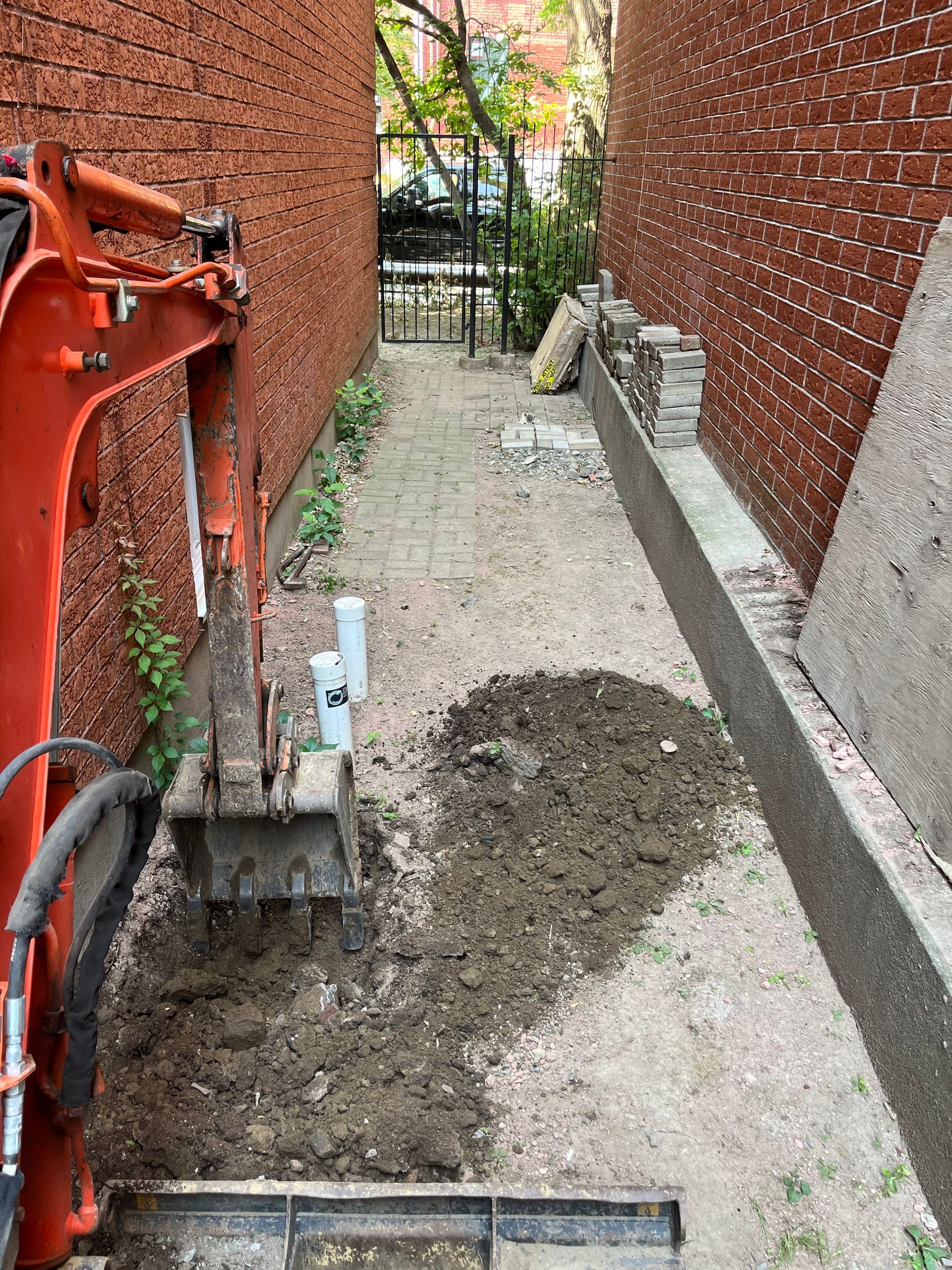 Un remplacement de drain français nécessite une excavation périmétrique autour de la fondation, souvent à une profondeur de 6 à 8 pieds. L'accès est fréquemment limité par la proximité des bâtiments voisins, des clôtures ou des aménagements paysagers.