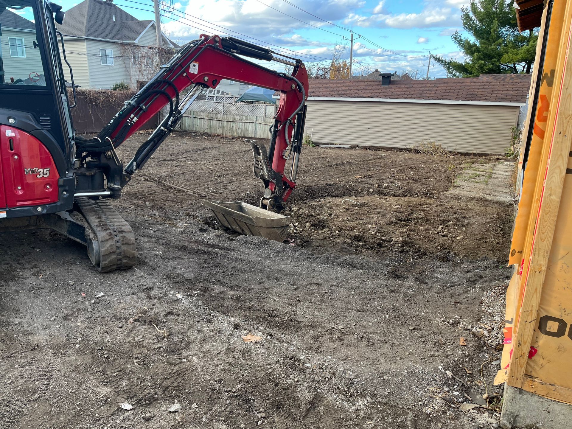 Certains projets nécessitent des travaux d'excavation qui ne sont pas liés directement au drainage ou à la fondation. Préparation de terrain pour aménagement extérieur, nivellement, retrait de sol contaminé ou création de pentes d'écoulement : nous adaptons l'équipement et la méthode à la portée du projet.